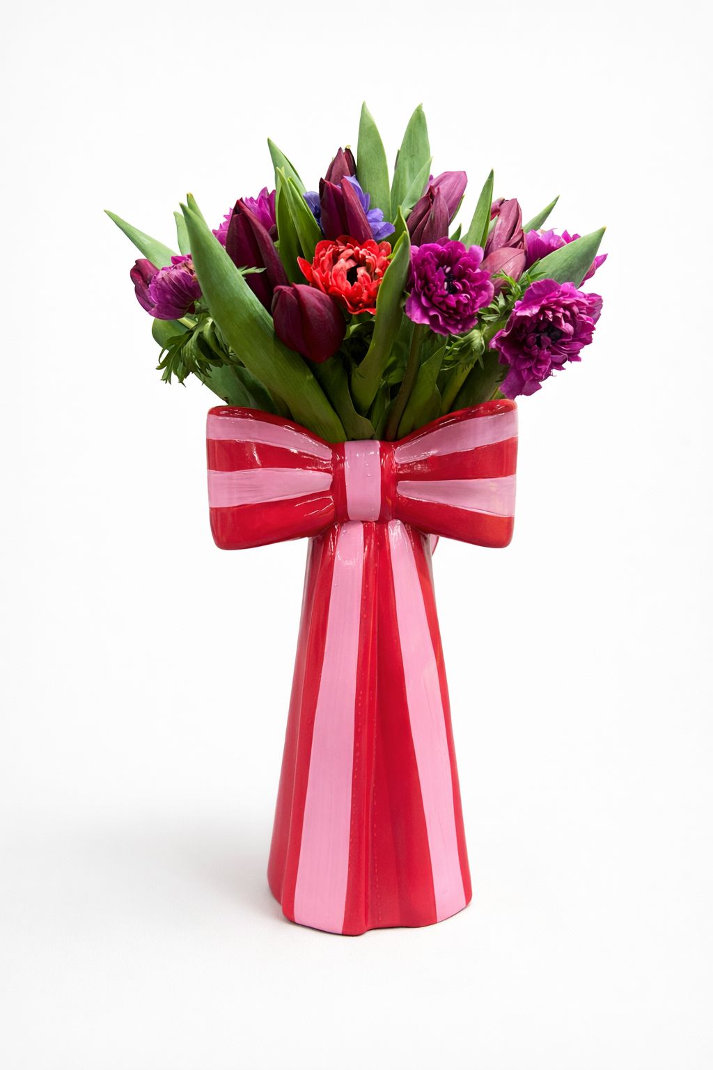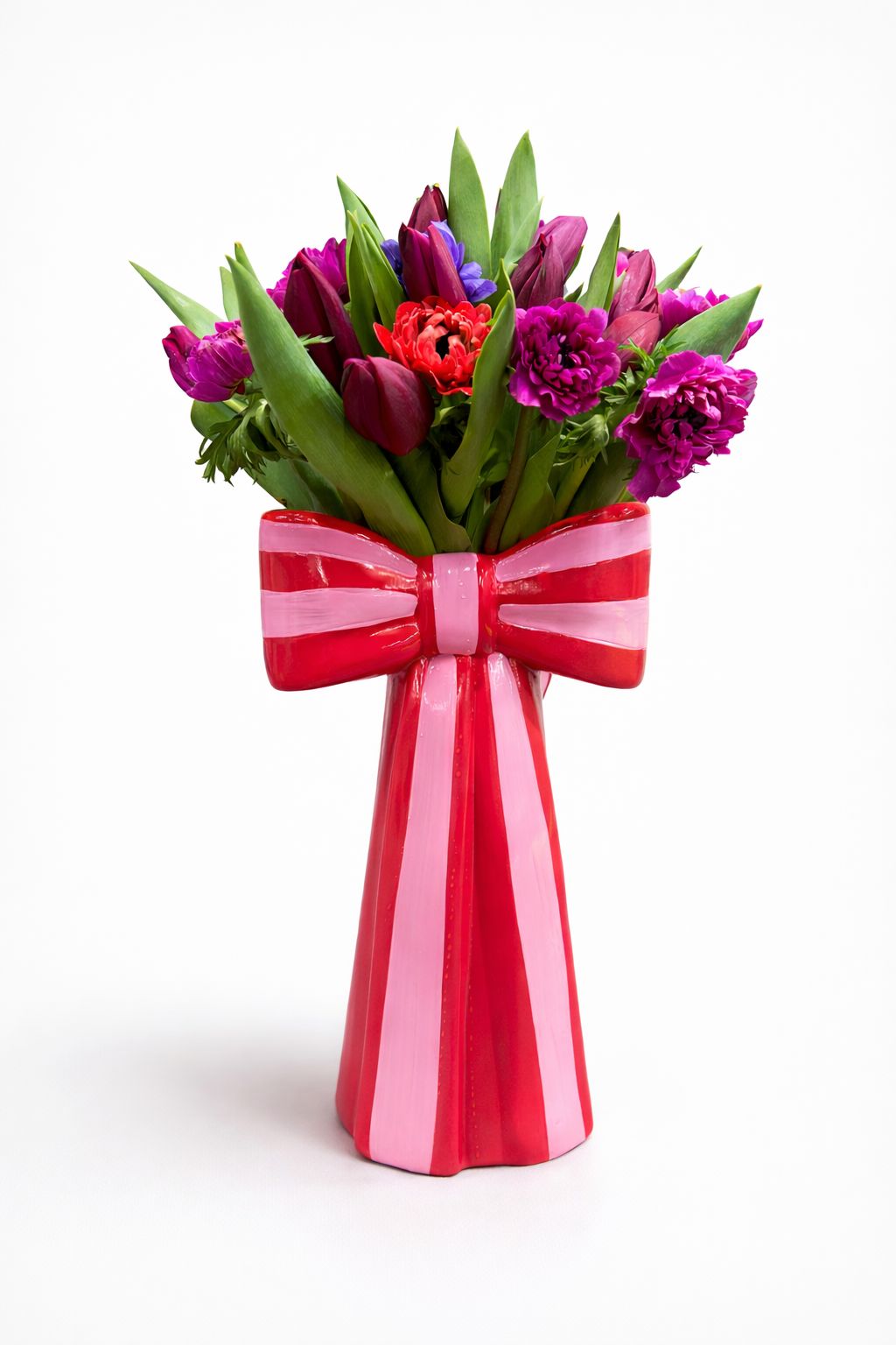 The Large Bow Vase features a generous arrangement of spring flowers, including tulips and anemones. This curated selection showcases the beauty of seasonal blooms, offering an elegant centerpiece that enhances any environment. Ideal for adding a touch of nature, it provides lasting enjoyment and aesthetic appeal.